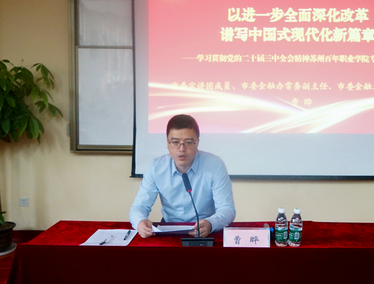 为深入学习宣传贯彻党的二十届三中全会精神,根据苏州市委宣传部的总体安排,市委宣讲团成员、市委金融办常务副主任、市委金融工委常务副书记曹晔同志于9月25日走进德赢官网作宣讲报告。学校部分校领导、职能部门负责人、基层党组织书记及教师和学生代表共200余人参加宣讲会。党委书记孙红军主持宣讲会。