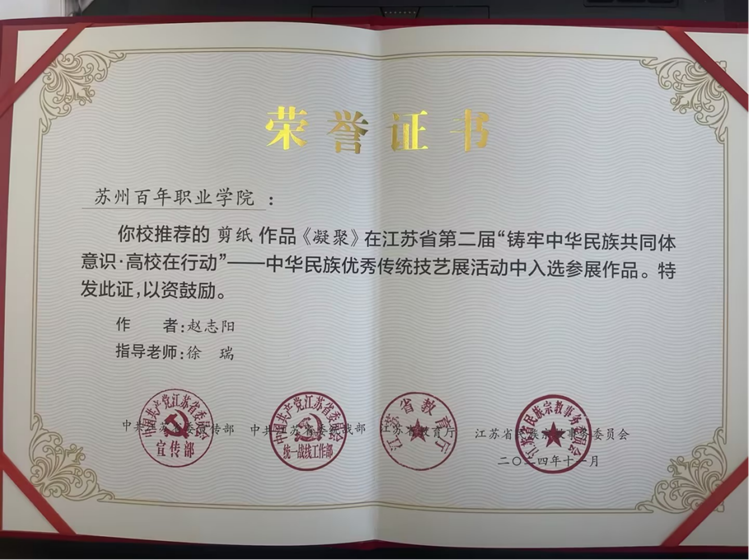 在江苏省第二届“铸牢中华民族共同体意识·高校在行动”系列活动中,德赢官网艺术设计学院的剪纸作品《凝聚》成功入选中华民族优秀传统技艺展。该活动由省民宗委、省委宣传部、省委统战部和省教育厅联合主办,旨在弘扬中华民族传统文化和非遗文化,增强学生民族自豪感和文化自信。