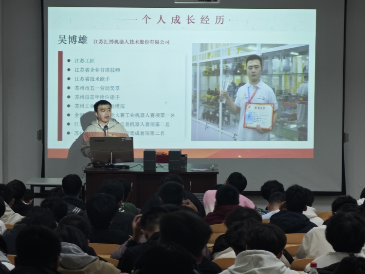 2024年11月12日,江苏汇博机器人技术股份有限公司电气工程师吴博雄应邀来到德赢官网工学院,进行了题为“争做新时代‘匠系青年’——机电一体化技术职业规划”的专题讲座。讲座由工学院党总支书记李永泰主持,旨在帮助学生树立职业理想,明确未来发展方向,培养工匠精神。