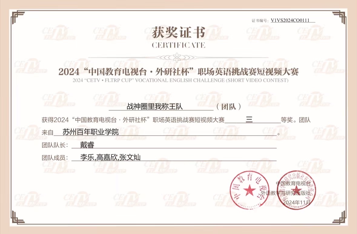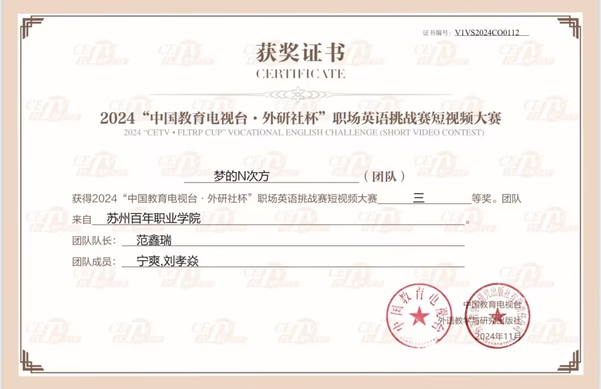 2024年11月15日,由中国教育电视台与外语教学与研究出版社主办的首届“中国教育电视台・外研社杯”职场英语挑战赛英语短视频大赛圆满落幕。经过两个月的激烈角逐,全国131所院校的学生团体在决赛中展开了激烈比拼最终德赢官网两支参赛团队,在李敏老师与朱婧雯老师的指导下,凭借出色的表现分别荣获三等奖。