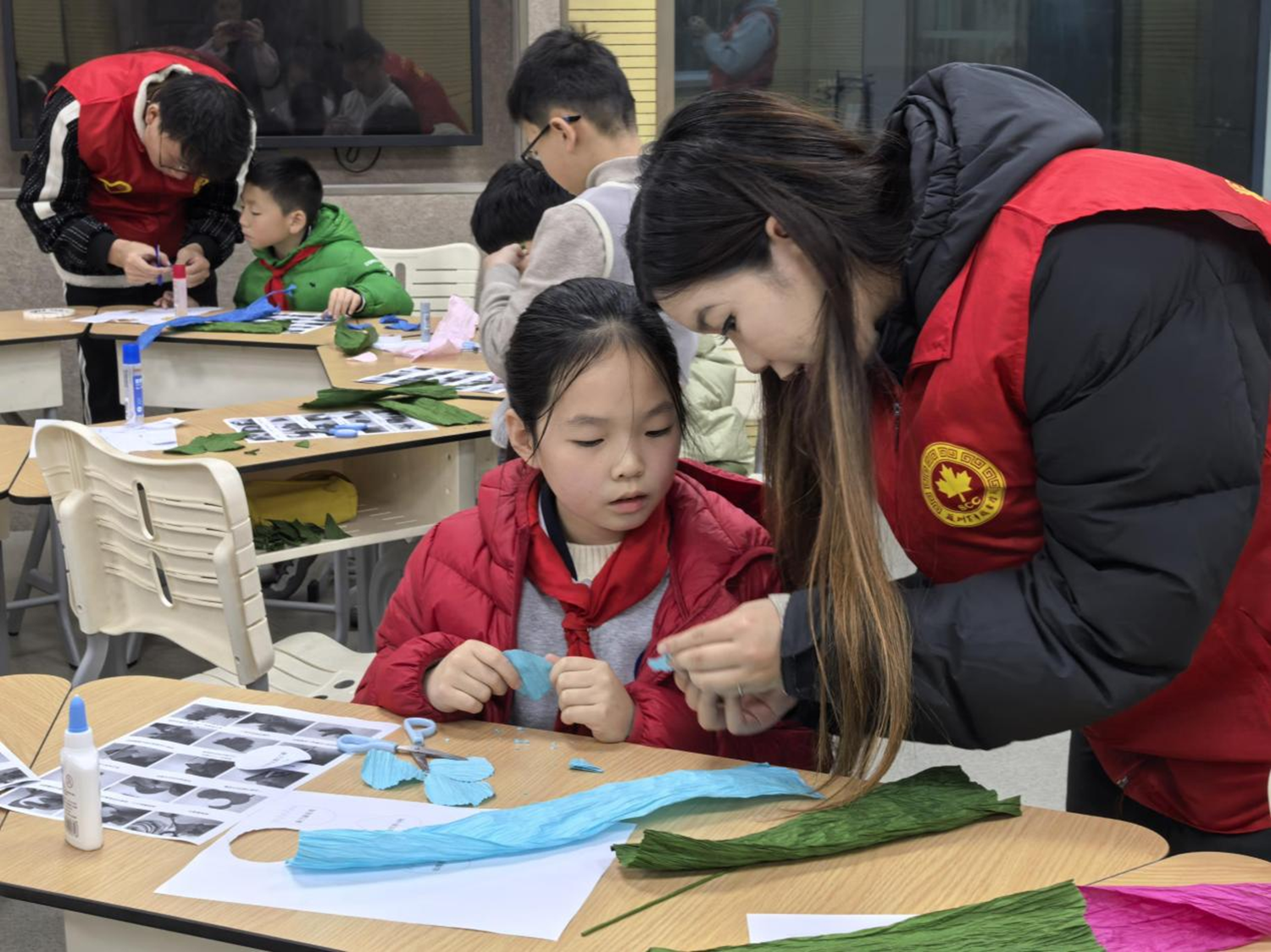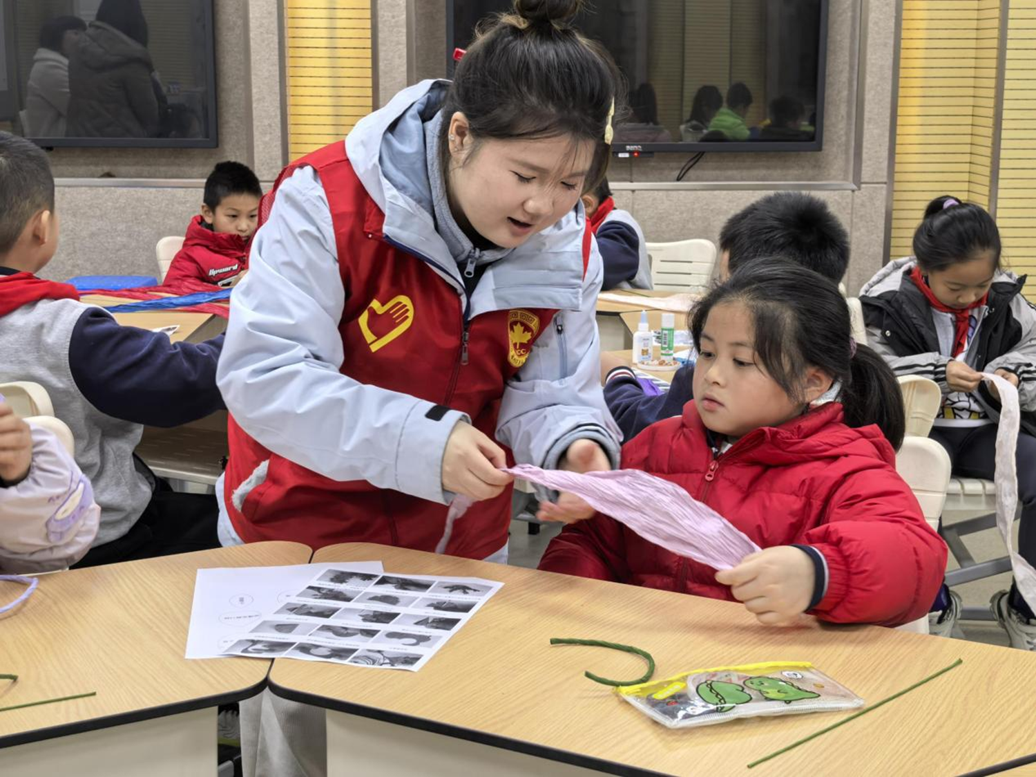 活动现场,志愿者们与孩子们进行互动,手把手教他们如何制作纸艺作品。孩子们的脸上洋溢着兴奋和好奇,他们认真地学习,不时发出惊叹和欢笑。通过这样的互动,孩子们不仅学会了制作纸艺作品,更重要的是,他们学会了表达自己的情感和创意。