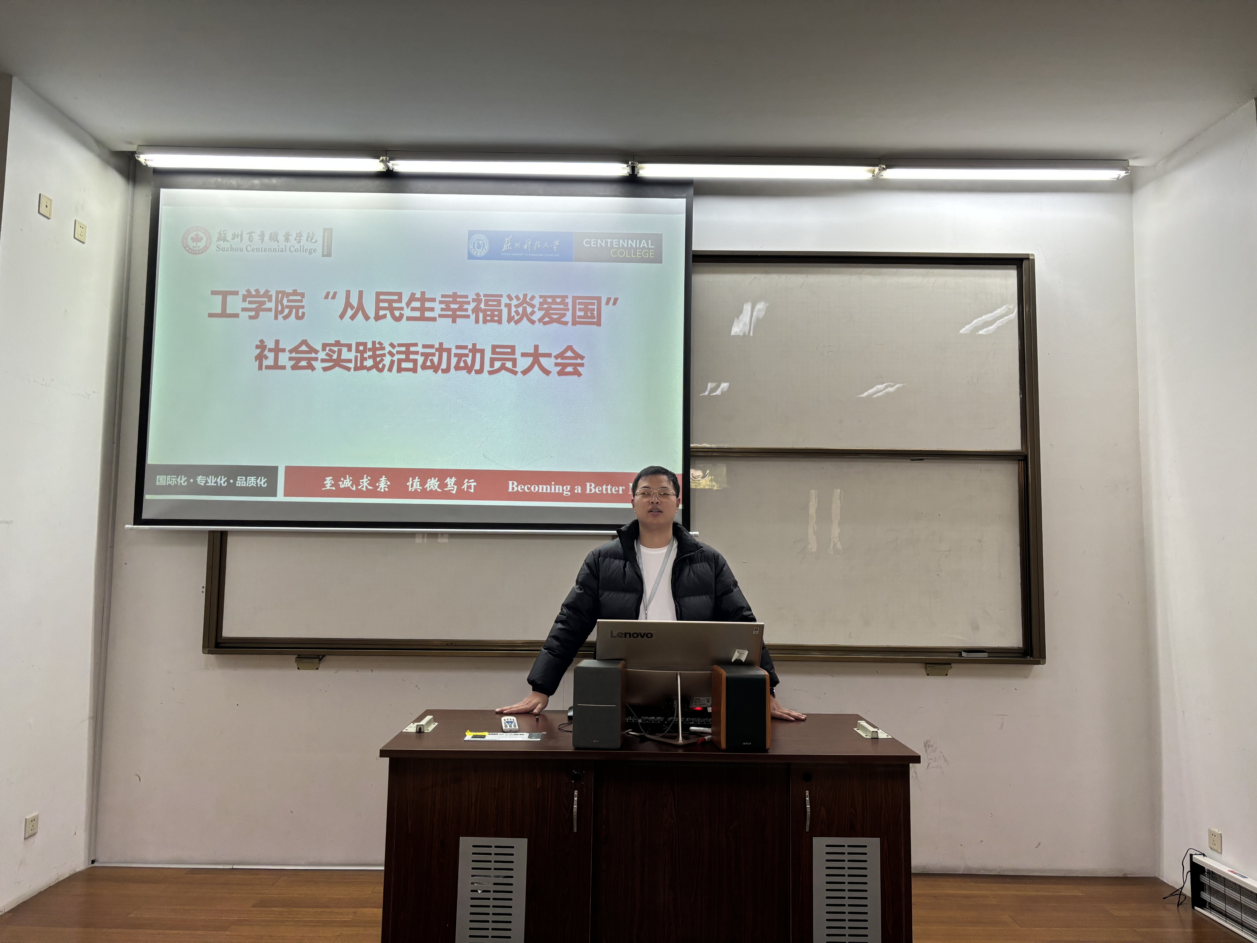 2024年12月13日下午,德赢官网工学院隆重举行了社会实践活动动员大会。本次社会实践活动以“从民生幸福谈爱国”为主题,结合学习提升、劳动教育、志愿服务及对中国传统节日民俗的传承与弘扬,加强爱国主义教育,引导学生深入理解国家发展、民生福祉与个人成长的关系,同时增强对中华优秀传统文化的认同感与自豪感。动员会由工学院分团委书记吴凯主持,吸引工学院2023级各专业学生参加。