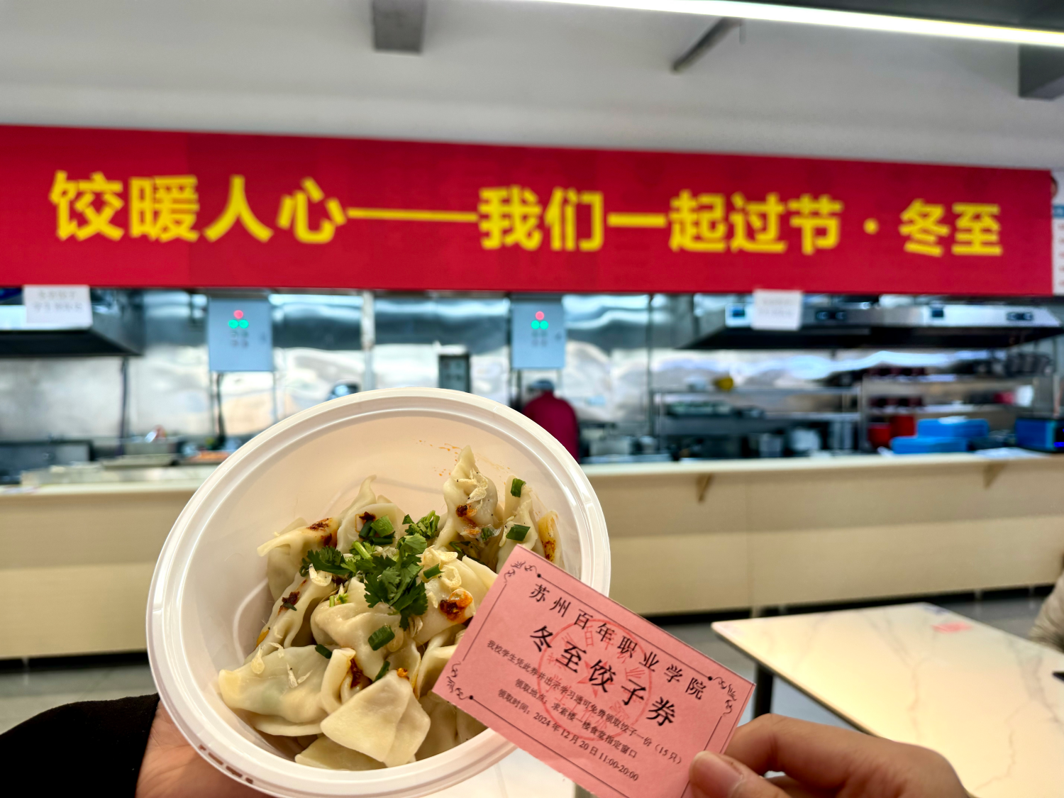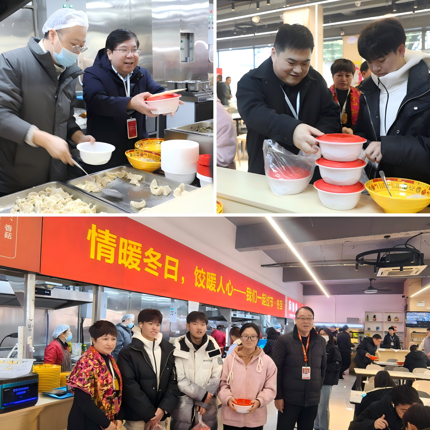 食堂里人声鼎沸、十分热闹,师生们纷纷排队领取到了热气腾腾的饺子。食堂工作人员忙碌而有序地为每一位学生分发着,大家手捧食堂精心准备的饺子,脸上洋溢着满足与幸福的笑容,纷纷表示这是他们在这个冬天收到的最温馨的礼物。