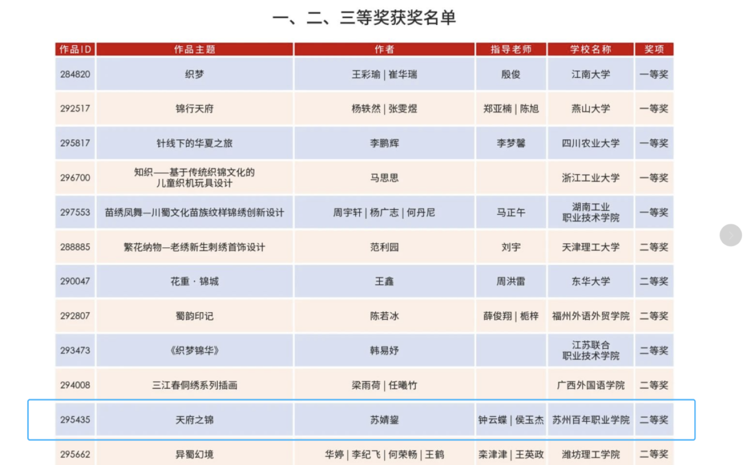 德赢官网苏婧鋆同学的作品《天府之锦》在未来工匠学院钟云蝶、侯玉杰老师指导下,在第九届“米兰设计周-中国高校设计学科师生优秀作品展”「非遗数字文创—锦绣设计大赛」中与众多院校及专业人士同台竞技,凭借出色的创意和扎实的技能荣获全国二等奖的好成绩(排名全国前20名)。获奖名单如下: