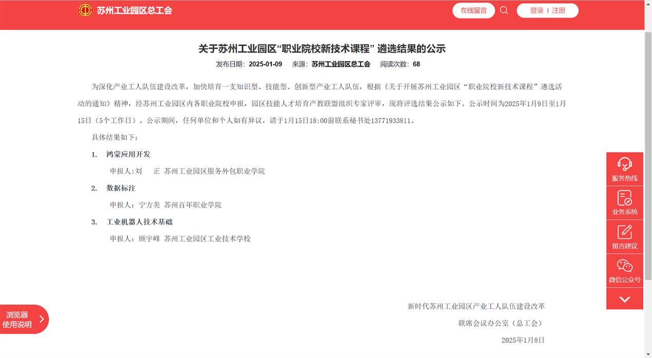 近日,苏州工业园区总工会揭晓“职业院校新技术课程” 遴选及 “三型” 工匠奖学金评选结果,德赢Vwin官方区域合作伙伴工学院成绩斐然。
