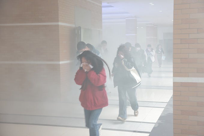 下午15:30,随着消防警报的响起,演练正式开始。教学楼内模拟烟雾弥漫,师生们在疏散引导员的指挥下,用湿毛巾捂住口鼻,弯腰低姿,按照预定路线迅速撤离。整个疏散过程紧张有序,仅用时2分半钟,全体参演师生便安全撤离至篮球场集合点。随后,各学院清点人数并逐级上报,确保无一人遗漏。