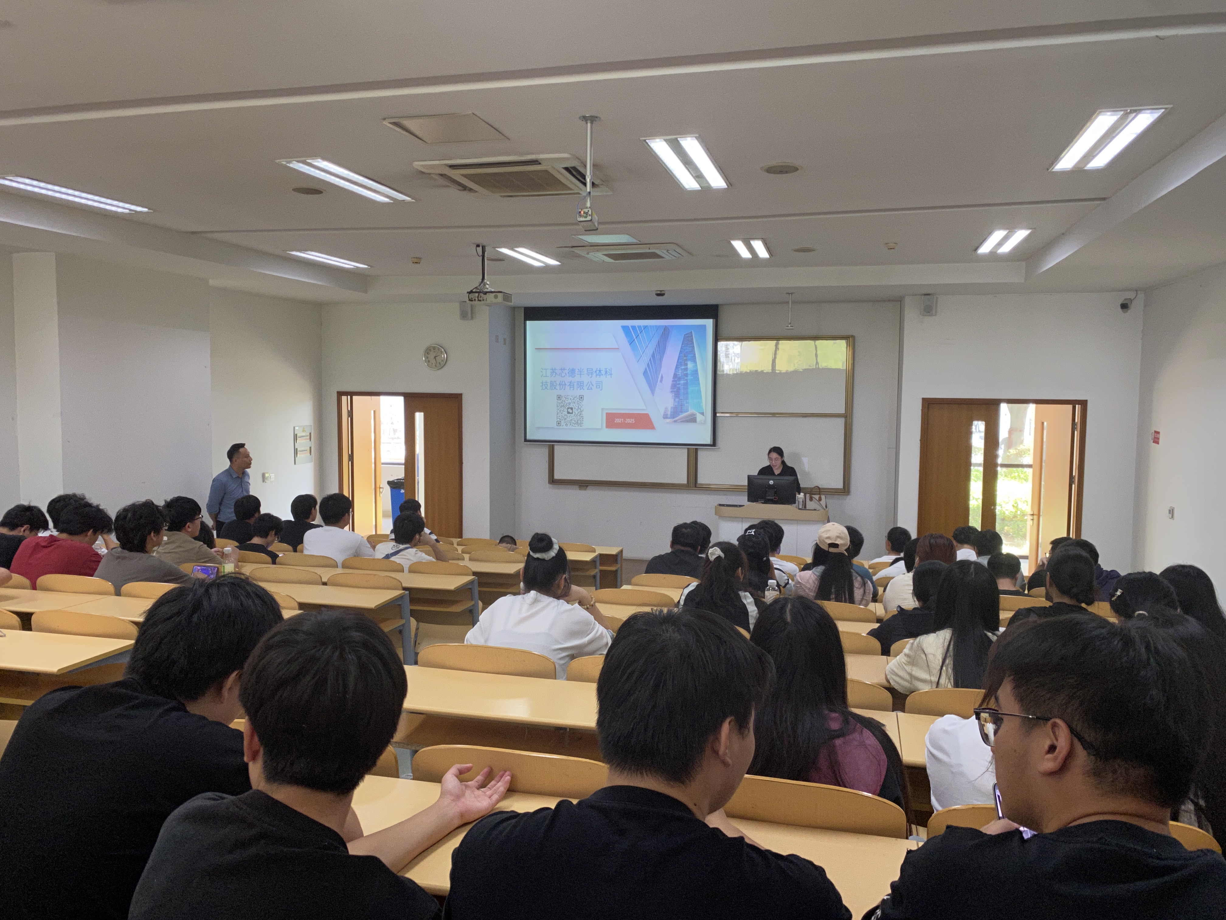 宣讲会上,受邀企业江苏芯德半导体科技股份有限公司通过播放宣传片、PPT展示、案例分析以及面对面交流等方式,详细介绍了企业发展历程、企业文化、业务范围、未来规划以及本次招聘的实习岗位要求、薪资福利和职业发展通道。