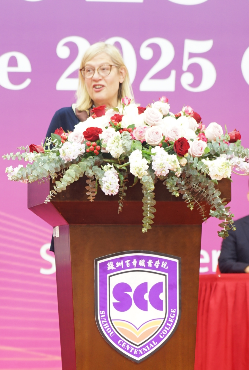 德赢官网董事长、加拿大百年理工学院副校长夏尔曼·海克致辞,她首先代表该校全体师生及校长史蒂文森博士向即将开启全新学习成长之旅的2025级新生表示祝贺。她希望更多德赢官网学生能前往加拿大百年理工学院继续深造,并介绍该校始终秉持对多元文化的包容与尊重,高度重视学生的自信融入与跨文化适应能力。她充分肯定了德赢官网教职工对跨国教育模式的贡献,并引用“千里之行始于足下”的中国古训,鼓励新生在学校搭建的国际化平台上勇敢启程,成为具备全球视野的终身学习者。