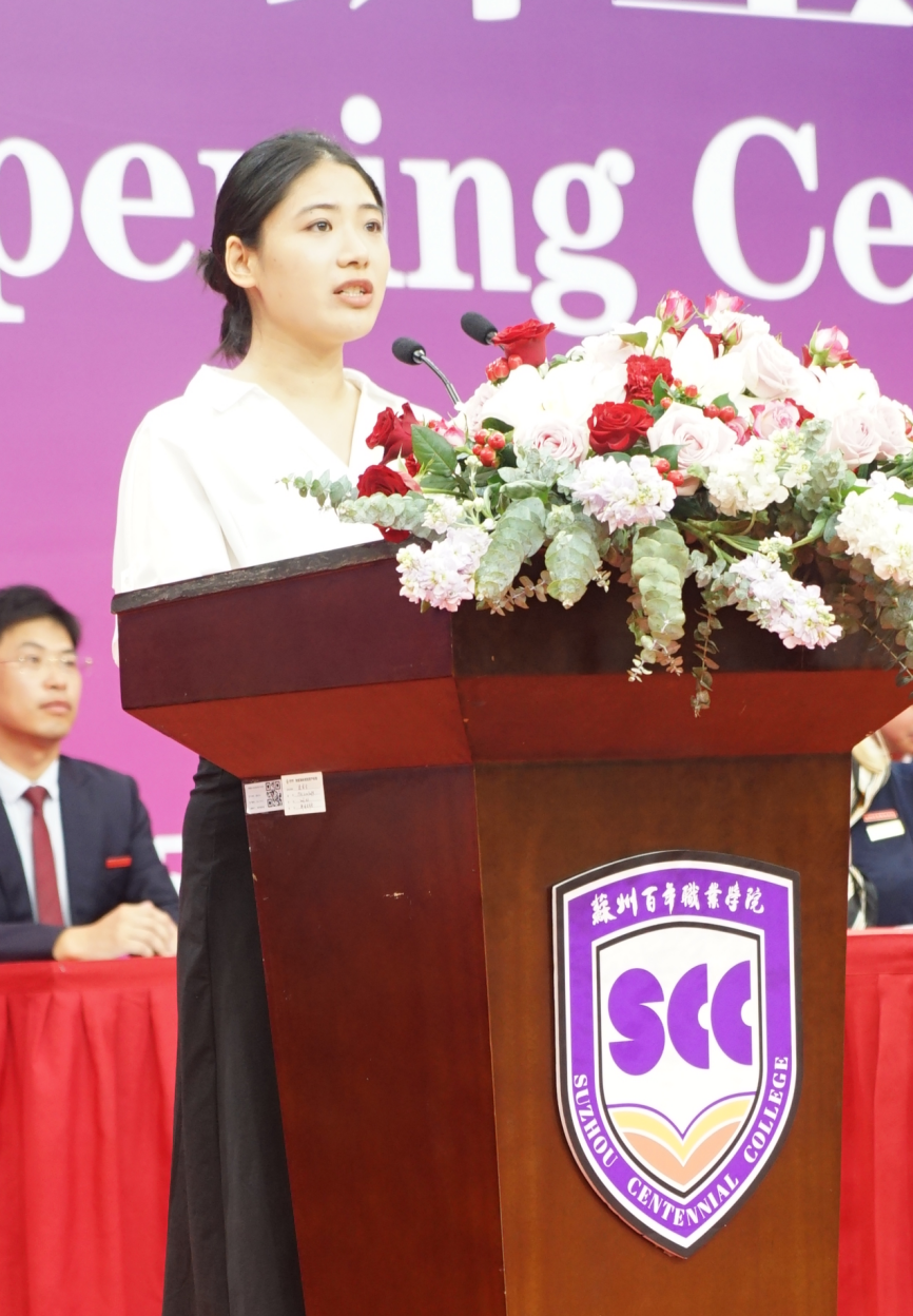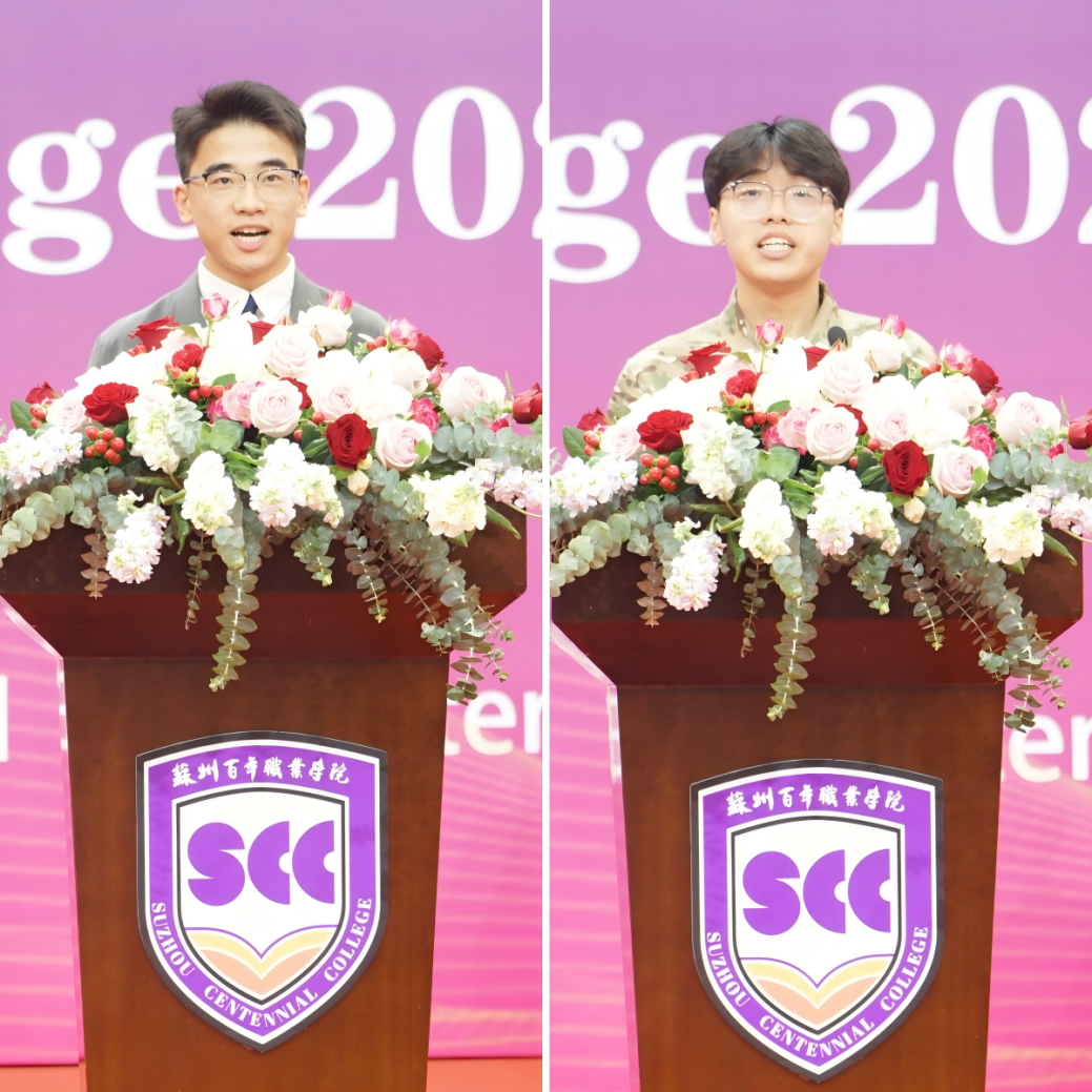 老生代表席浩轩以学长身份分享大学心得,强调通过课堂互动、社团活动、技能竞赛等多元途径培养综合素养的重要性,鼓励新生在包容互助的校园文化中实现海外升学、国内转本或高质量就业的多元目标。新生代表卫泽军则结合校训“至诚求索,慎微笃行”,承诺以课堂专注、实践投入和团队协作作为成长基石,将品格修养与专业追求相融合,并特别强调了学校国际化英语教学环境对拓展全球视野的重要性。
