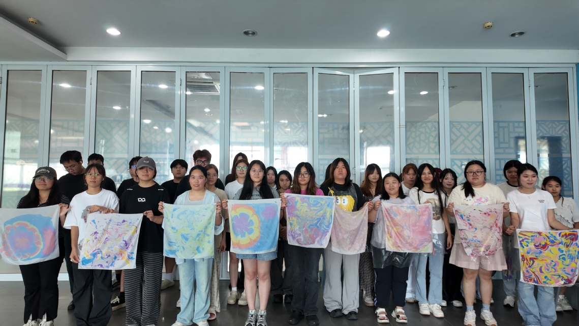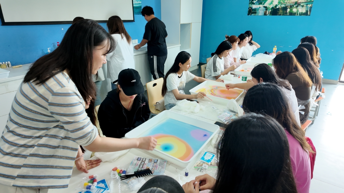 在制作体验环节,学院为同学们备齐环保颜料、素绸缎丝巾、画针等专业材料,老师示范滴颜料、拨纹路、拓印、固色等步骤后,学生纷纷上手创作,涌现出水墨风、撞色设计等风格各异的作品,同学们纷纷表示在完成亲手拓印丝巾制作的成就感独一无二!
