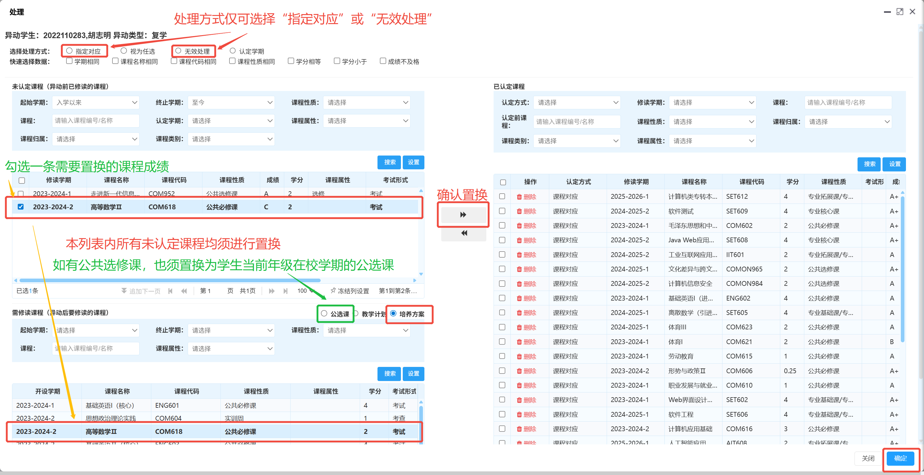 打开“学籍管理-学籍异动管理-异动成绩处理”模块,选择“2024-2025-2”和“2025-2026-1”学期,点击操作列的“处理”按钮打开处理页面,按学分置换操作说明(附件5)所示操作。