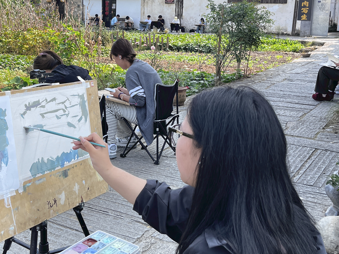 屏山村作为徽文化的重要遗存,以其白墙黛瓦、幽深古巷与静谧溪流,为同学们提供了生动的创作课堂。在这里,每一处风景皆可入画,每一片光影皆成构图,同学们在自然与人文交融的环境中捕捉灵感,锤炼艺术感知。