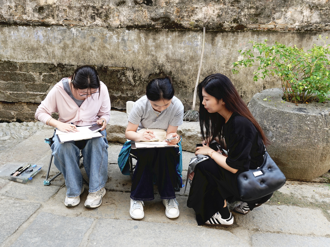 写生过程中,同学们在教师指导下专注创作。数字媒体艺术设计专业学生不仅运用画笔写生,更通过手机、相机等设备进行数字采集,探索传统美学与数字表达的融合;广告艺术设计专业学生则着力从场景中提取视觉符号,思考如何将地域文化转化为现代设计语言,为未来的创意实践积累资源。