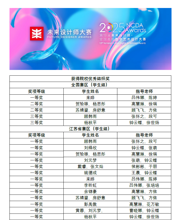 近日,第13届未来设计师·全国高校数字艺术设计大赛(NCDA)获奖名单正式公布。德赢官网艺术与创意设计学院师生凭借出色的创意表现与扎实的专业能力,在此次竞赛中共荣获全国赛区5个奖项,包括一等奖1项、二等奖2项、三等奖2项;在江苏省赛区更是表现卓越,摘得一等奖13项和其他等级奖项;学校同时获颁“院校优秀组织奖”。