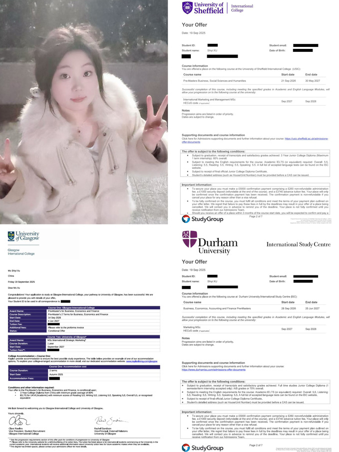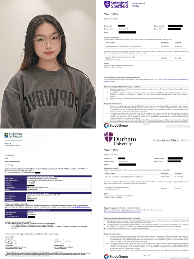 录取院校:杜伦大学(QS 2025 年排名 Top 78)、格拉斯哥大学(QS 2025 年排名 Top 74)、谢菲尔德大学(QS 2025 年排名 Top 90)