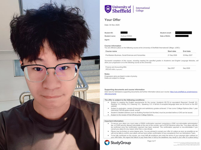 近日,数字经济与管理学院海外升学版图再添新彩!作为德赢官网2025年首批“海外升学”项目的又一名优秀学子,来自工商企业管理2302班的王祖帅同学,凭借扎实的专业知识储备、出色的跨文化沟通能力与清晰的学术规划,成功斩获QS 2026世界第 92位 英国名校——谢菲尔德大学的预录取通知书,不仅延续了德赢官网“海外升学” 项目的升学佳绩,更为全校有志于海外深造的学子树立了“精准规划、稳步提升” 的优秀典范!