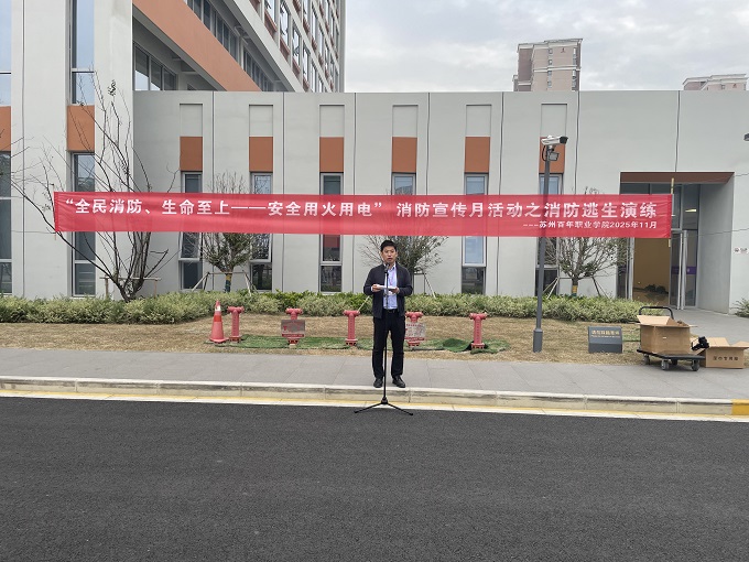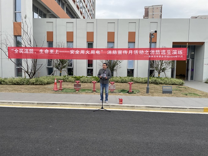 为迎接第34个全国消防日,深入贯彻落实"全民消防、生命至上——安全用火用电"的消防宣传月主题,德赢Vwin官方区域合作伙伴于2025年11月4日成功举办了年度消防应急疏散演练活动。此次活动由校长助理袁祥担任总指挥,学生事务部(安全保卫部)胡赛主任统筹组织,独墅湖消防中队官兵、各二级学院辅导员、学生代表以及学校警务室人员、物业保安、食堂工作人员共同参与。