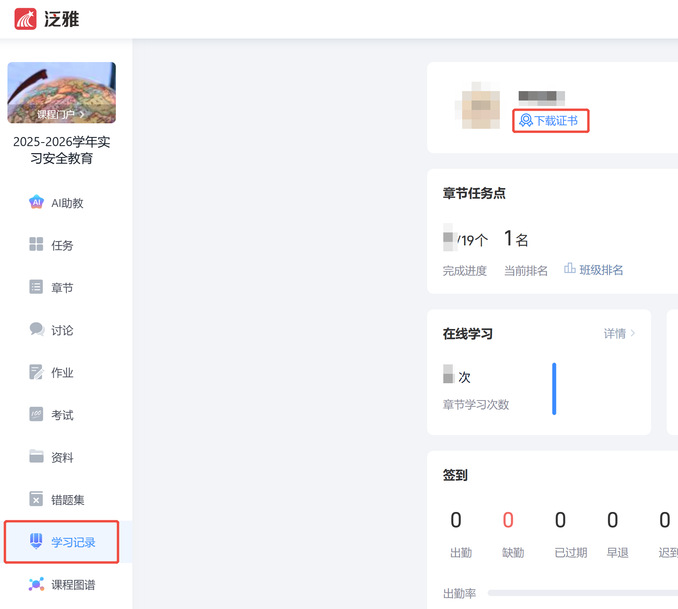 4.证书下载:登录超星平台,进入“2025-2026学年实习安全教育”课程,点击“学习记录”,选择“下载证书”。